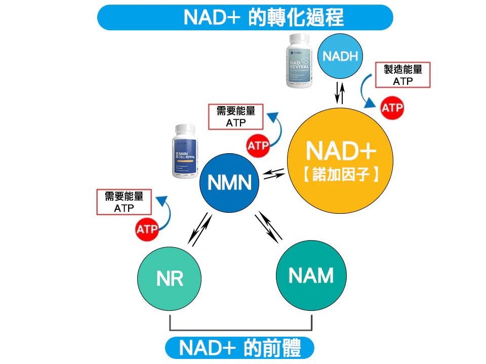 - NMN 是NAD+的前體,可以快速轉化成NAD+,提升體內NAD+ 水平。