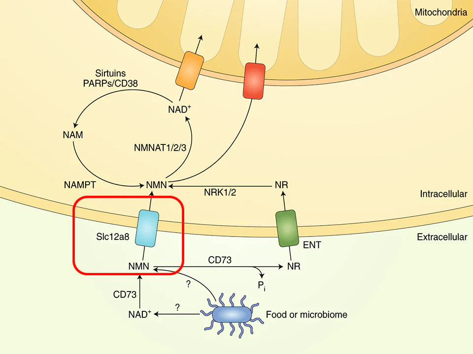 根據科學期刊「Nature」的一篇報告指,科學家已經找出能夠讓細胞直接吸收NMN的運輸蛋白(NMN transporter)—Slc12a8。這種蛋白能夠直接進入細胞內部,最快15分鐘提升NAD+水平。